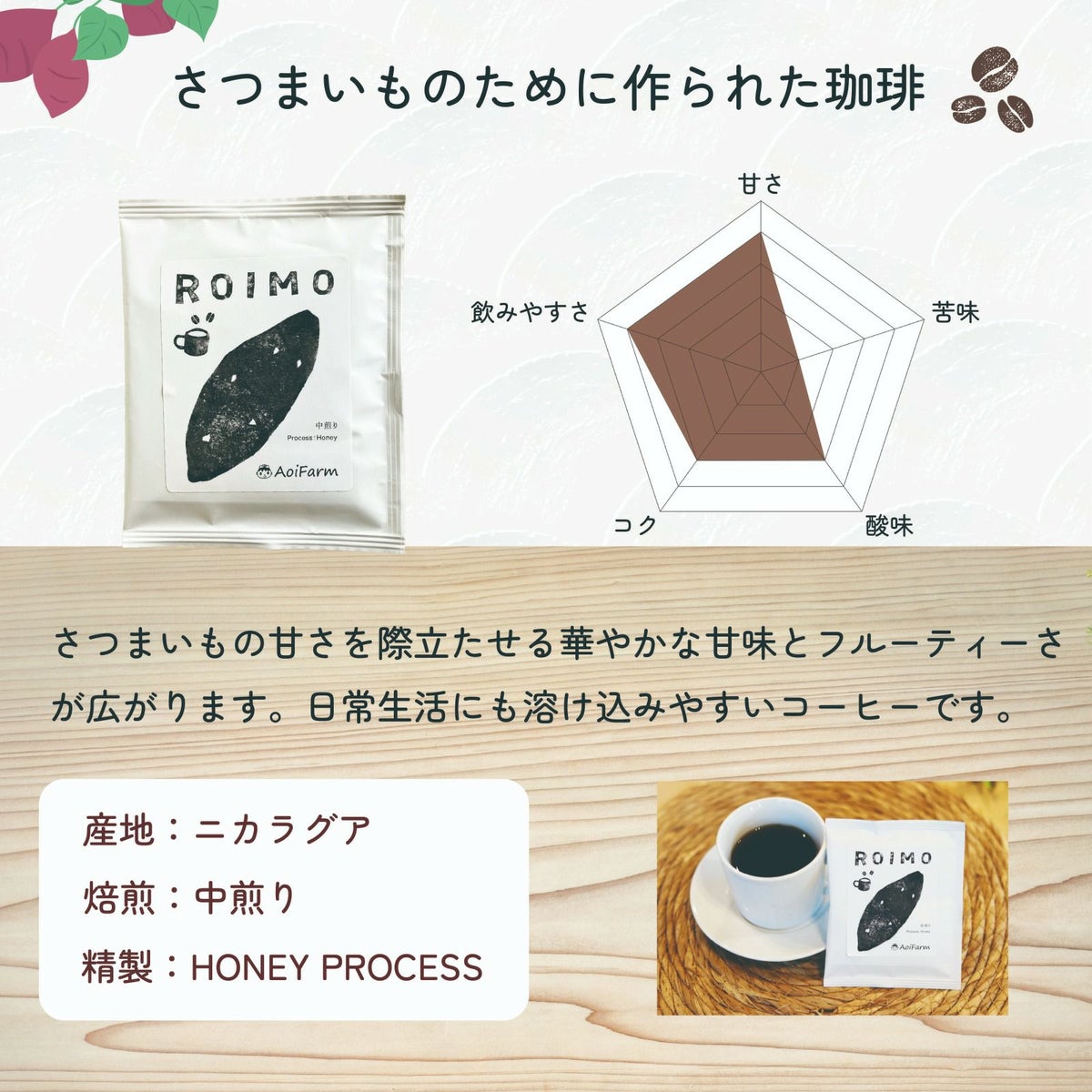 他の画像を見る 至福のペアリングセット|さつまいも専用コーヒー「ROIMO」5袋 & 熟成冷凍焼き芋「葵はるか」1kg 予約商品 こちらは予約商品です 予約販売価格 ¥ 3,580 税込 カートに入れる お気に入りに登録する