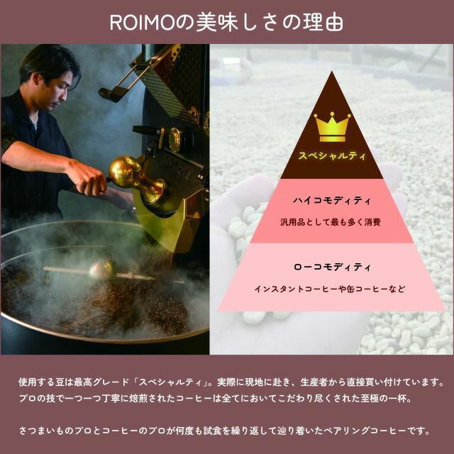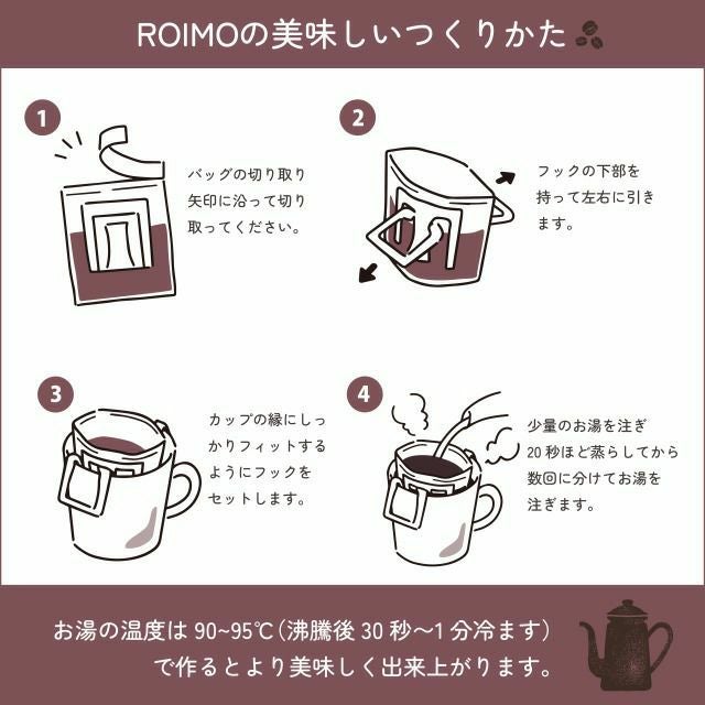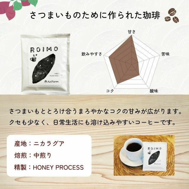 他の画像を見る さつまいも専用コーヒー ROIMO|甘さを引き立てる特別焙煎 ドリップコーヒー 10袋入 予約商品 こちらは予約商品です 予約販売価格 ¥ 3,980 税込 カートに入れる お気に入りに登録する